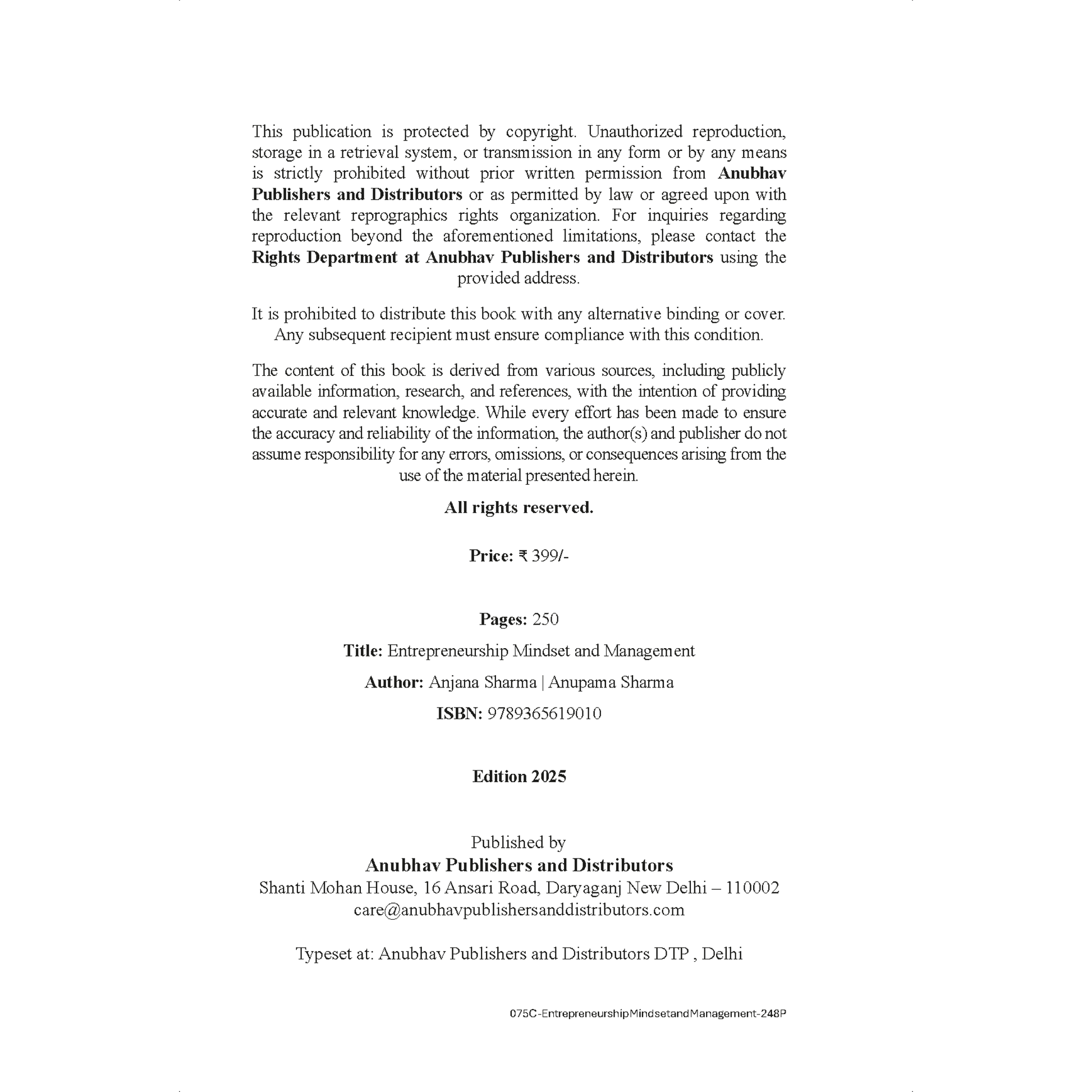 Entrepreneurship Mindset and Management: A Handbook by Anjana Sharma and Anupama Sharma provides a comprehensive framework for understanding entrepreneurship as both a mindset and a management practice. It combines theoretical foundations with applied knowledge, covering entrepreneurial values, opportunity recognition, project planning, creativity, business ethics, and international trade. Special emphasis is placed on the Indian entrepreneurial ecosystem, highlighting small business opportunities, policy support, and future growth trends. Structured into logical units, the book is designed to help learners, educators, and aspiring entrepreneurs connect academic knowledge with real-world practices.