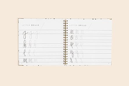Perfect for complete beginners, the book includes detailed practice sheets for uppercase and lowercase letters, connecting strokes, embellishments, and flourishes. It also covers basic strokes, pen pressure control, and layout tips — all demonstrated in a clean, inviting style. Its spiral binding allows the book to lie flat, making it incredibly user-friendly for practice sessions.